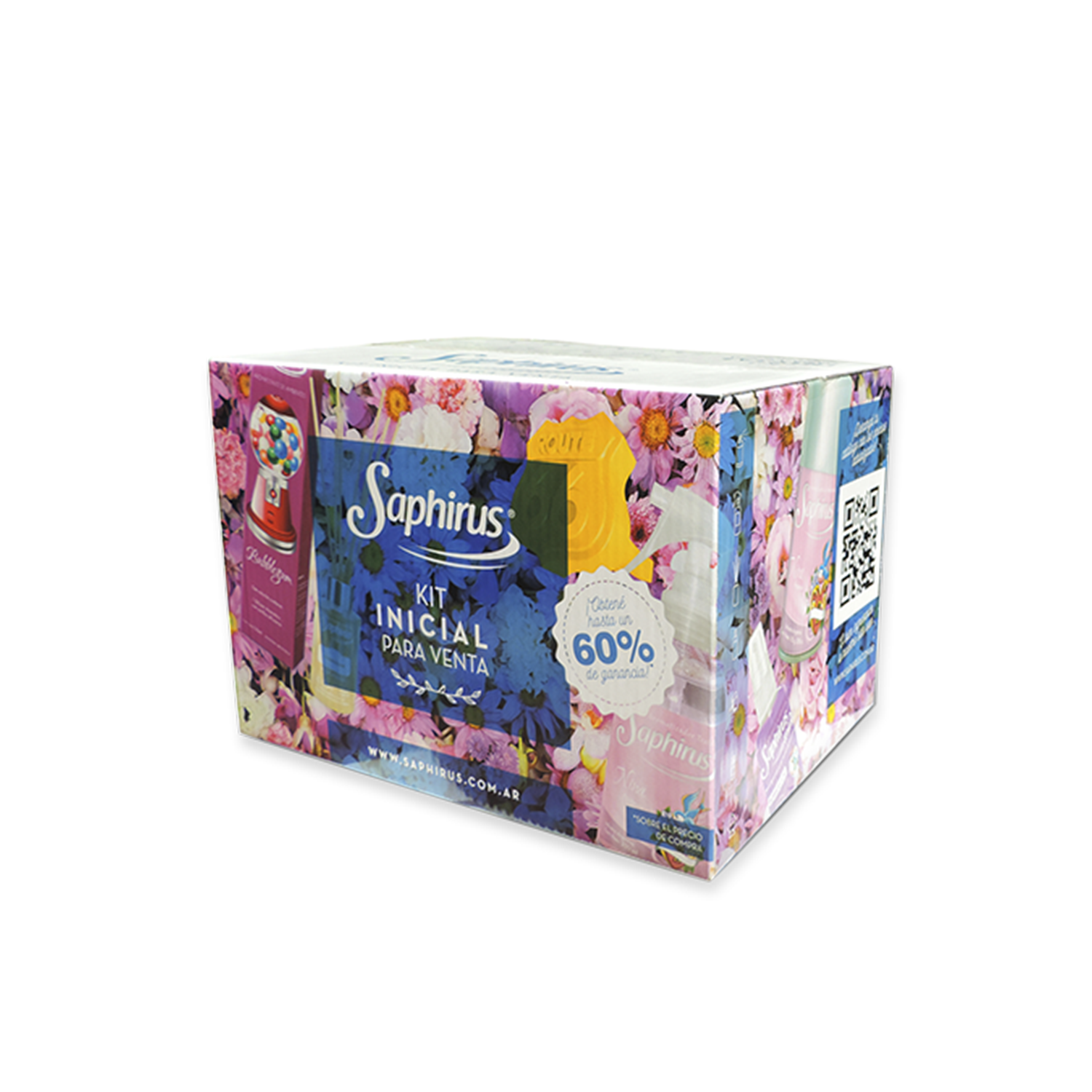 Incluye: 8 aromatizantes en aerosol, 8 aromatizadores textiles, 6 difusores aromáticos, 6 aromatizantes de ambiente Saphirus Mini para autos y espacios pequeños, 4 autoaromas Route 66, 2 aceites esenciales Saphirus, 2 Sensaciones y catálogos + birome y bolsitas de regalo